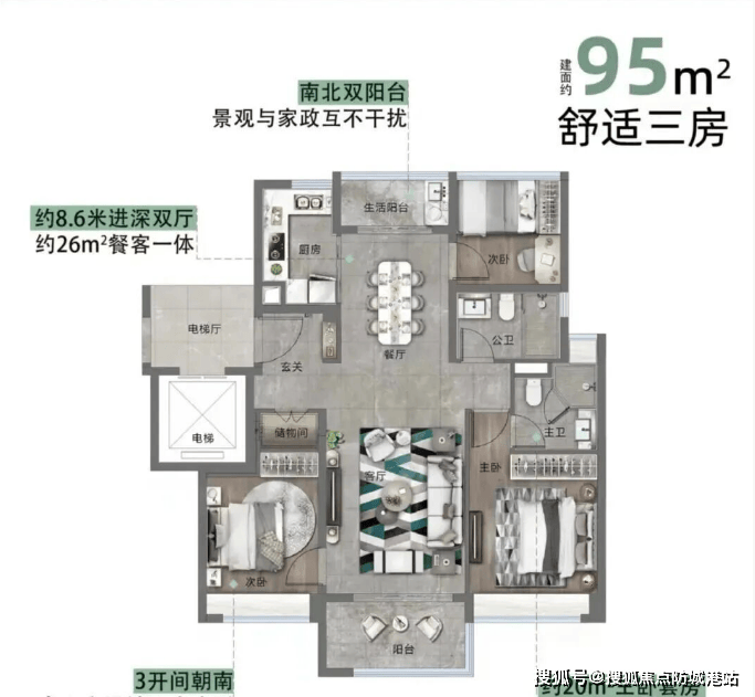 :2 梯 2 户板式设计,南北通透,双阳台分区,三开间朝南,近 10 米南向面宽,卧室飘窗全赠送,空间利用率高,适合刚需小家庭、年轻夫妇。