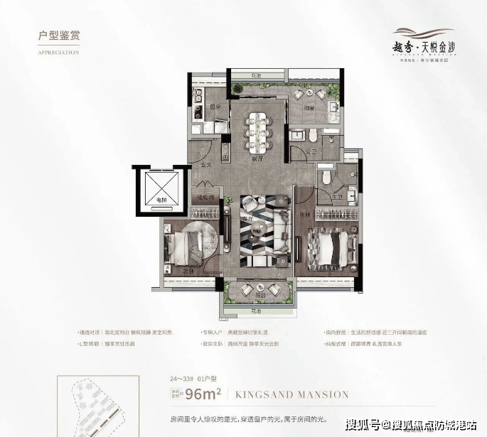 :南向三开间,6.85 米阔景阳台,270°L 型观景面,适合多孩家庭、三代同堂,空间宽敞、功能齐全。